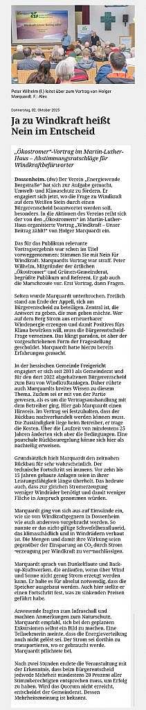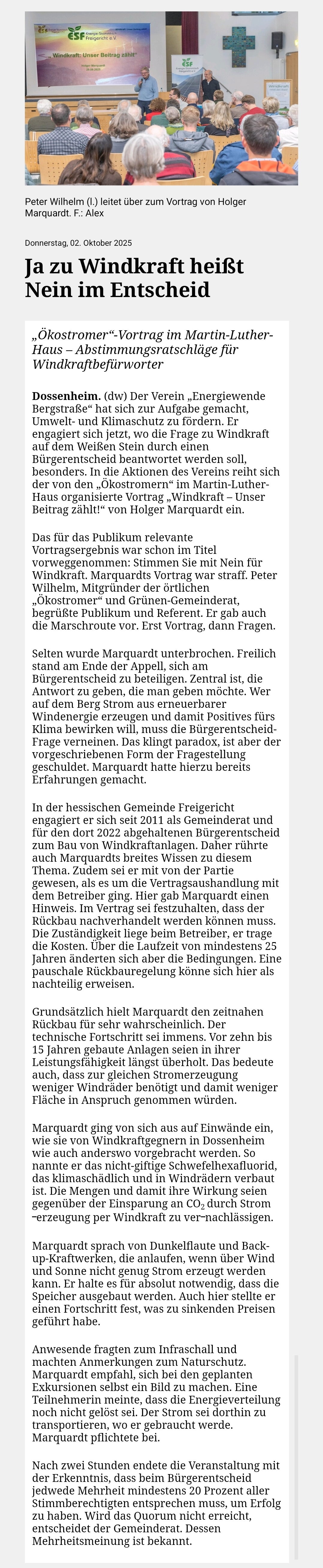 Ja zur Windkraft heißt Nein im Entscheid 2. Oktober 2025 / Rhein-Neckar-Zeitung / Keine Kommentare “Ökostromer”-Vortrag im Martin-Luther-Haus – Abstimmungsratschläge für Windkraftbefürworter