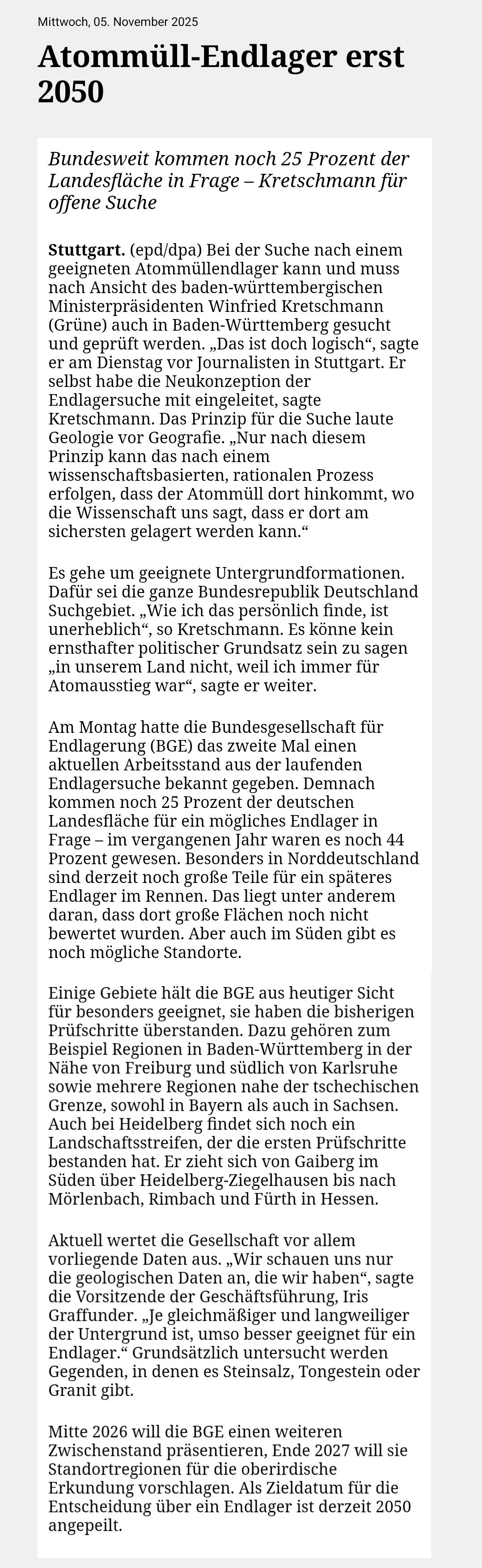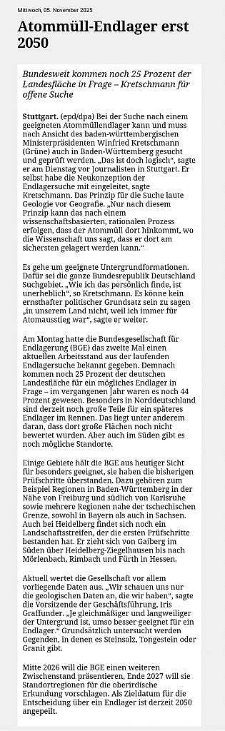Atommüll-Endlager erst 2050 5. November 2025 / Rhein-Neckar-Zeitung / Keine Kommentare Bundesweit kommen noch 25 Prozent der Landesfläche in Frage – Kretschmann für offene Suche Energiewende Baden-WürttembergDeutschlandDossenheimEnergiewendeHeidelbergRhein-Neckar-KreisSchriesheim Vorheriger Beitrag Die EU ringt um ihre Klimaziele Nächster Beitrag Ewigkeitschemikalien im Trinkwasser Schreibe einen Kommentar Antworten abbrechenDeine E-Mail-Adresse wird nicht veröffentlicht. Erforderliche Felder sind mit * markiertKommentar * Name * E-Mail * Website Meinen Namen, meine E-Mail-Adresse und meine Website in diesem Browser für die nächste Kommentierung speichern.