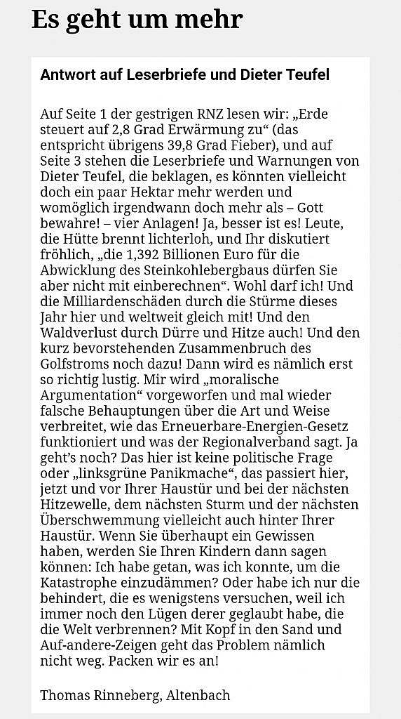 Denn es geht hier nicht nur um den Wald am Weißen Stein oder die Finanzen unserer Gemeinden. Es geht auch um unseren eigenen Beitrag – dafür, dass auch kommende Generationen auf dieser Welt noch gut leben können. Denn eines dürfen wir bei dieser Diskussion nie vergessen: Die Alternativen zur Windkraft – Öl, Gas und Kohle – haben erst zu der Klimakrise geführt, in der wir jetzt stecken.
