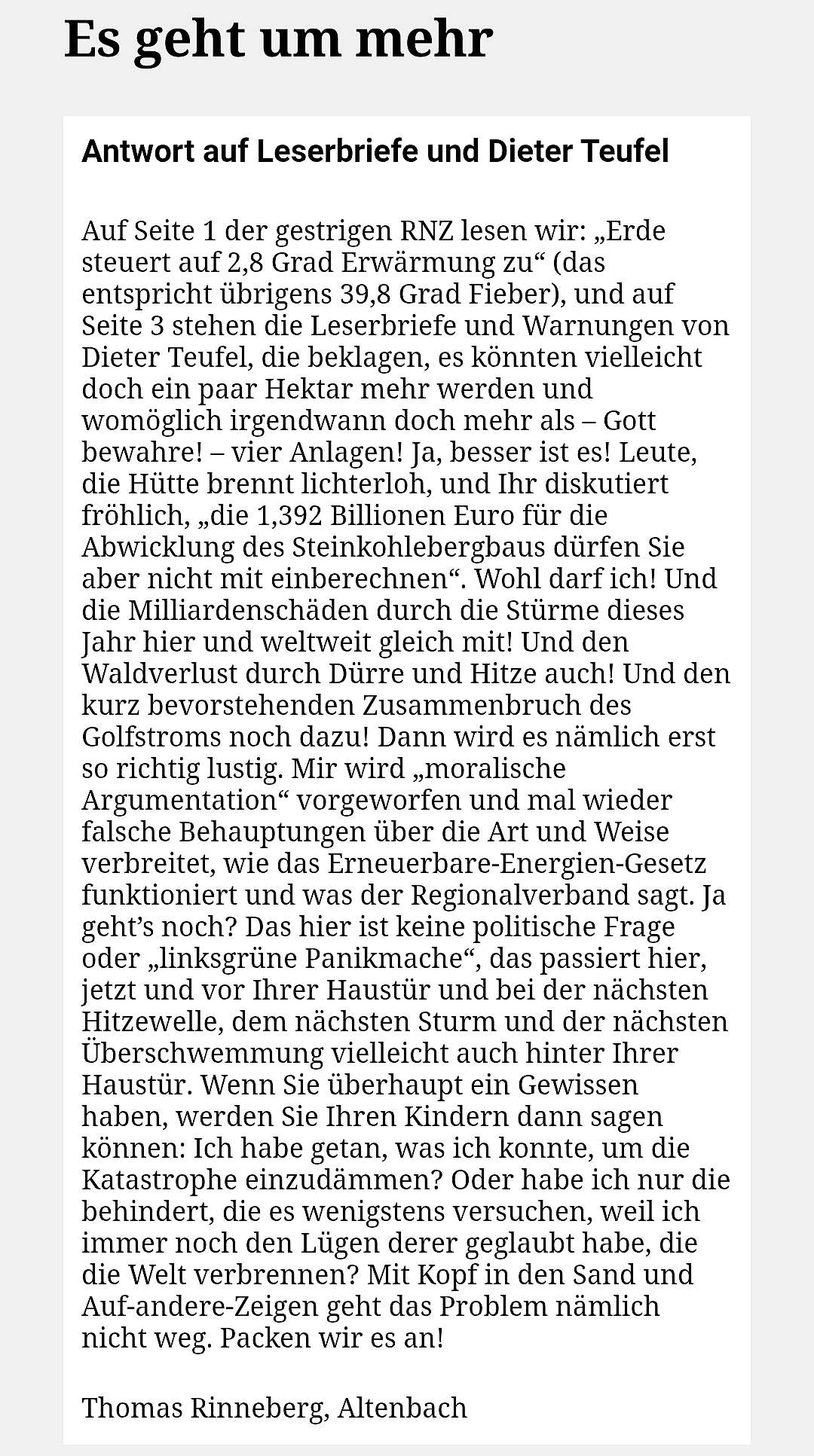 Denn es geht hier nicht nur um den Wald am Weißen Stein oder die Finanzen unserer Gemeinden. Es geht auch um unseren eigenen Beitrag – dafür, dass auch kommende Generationen auf dieser Welt noch gut leben können. Denn eines dürfen wir bei dieser Diskussion nie vergessen: Die Alternativen zur Windkraft – Öl, Gas und Kohle – haben erst zu der Klimakrise geführt, in der wir jetzt stecken.