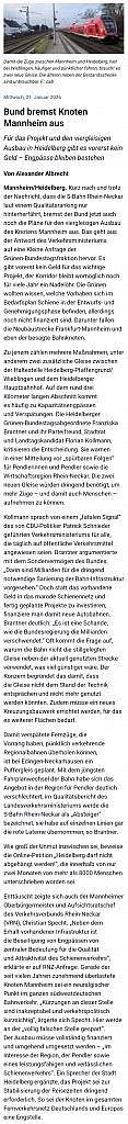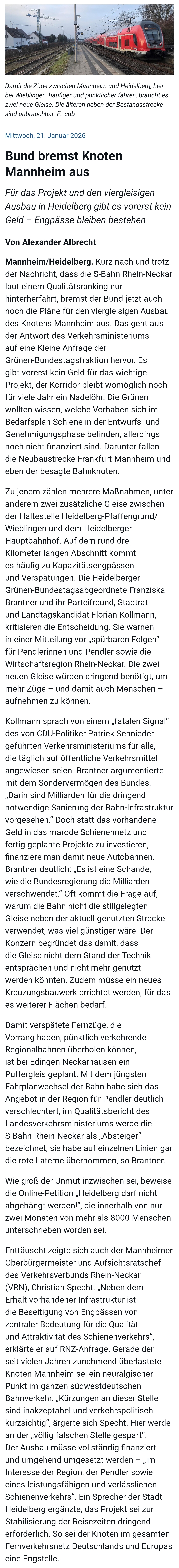 Bund bremst Knoten Mannheim aus 21. Januar 2026 / Rhein-Neckar-Zeitung / Keine Kommentare Für das Projekt und den viergleisigen Ausbau in Heidelberg gibt es vorerst kein Geld – Engpässe bleiben bestehen Mobilität Mobilität Vorheriger Beitrag “Schnee-Apokalypse” auf Kamtschatka Nächster Beitrag Zuschuss für Balkonkraftwerke Schreibe einen Kommentar Antwort abbrechenDeine E-Mail-Adresse wird nicht veröffentlicht. Erforderliche Felder sind mit * markiertKommentar * Name * E-Mail * Website Meinen Namen, meine E-Mail-Adresse und meine Website in diesem Browser für die nächste Kommentierung speichern.
