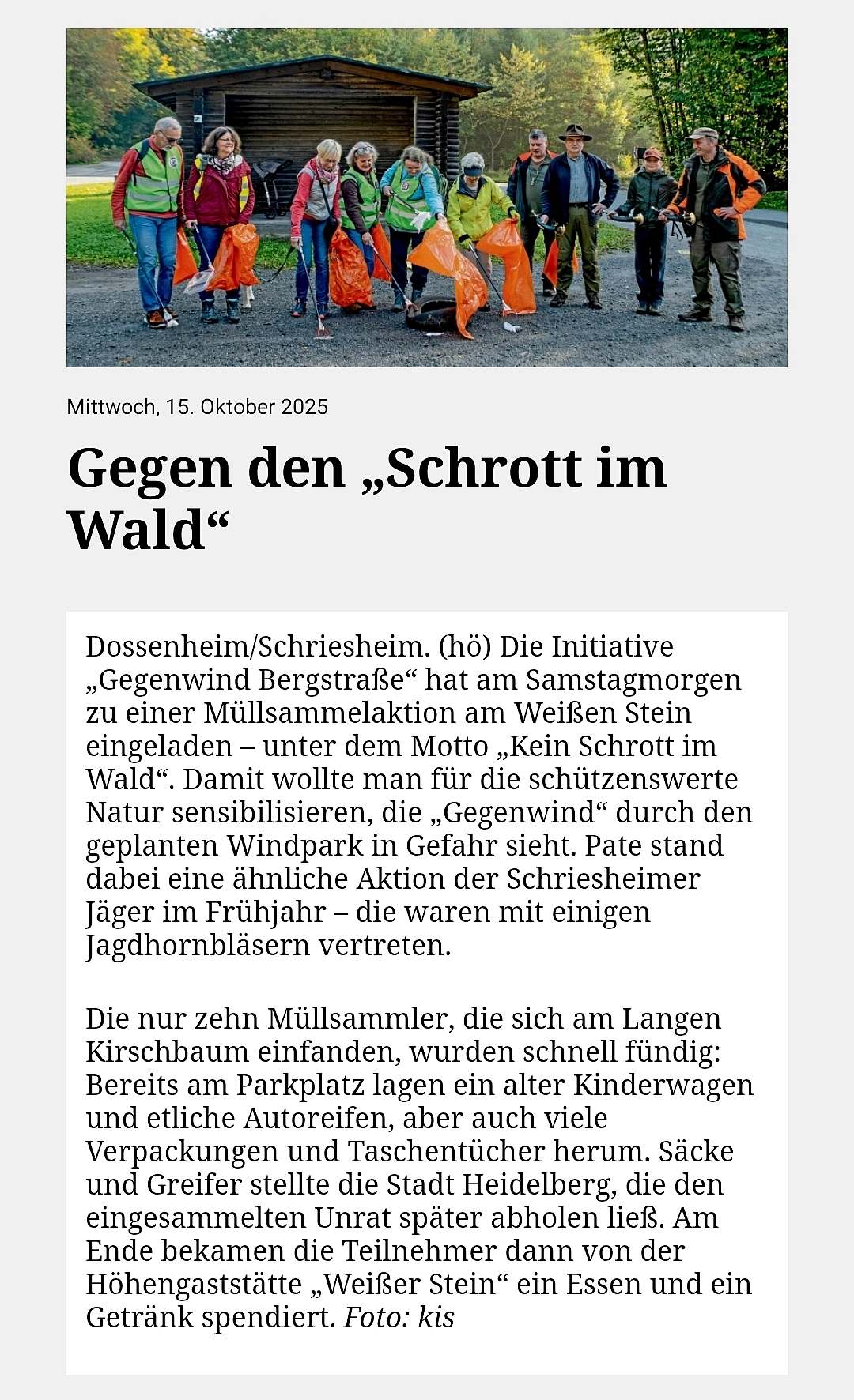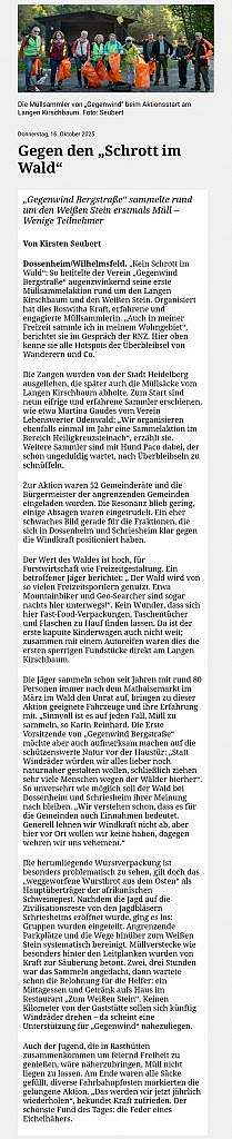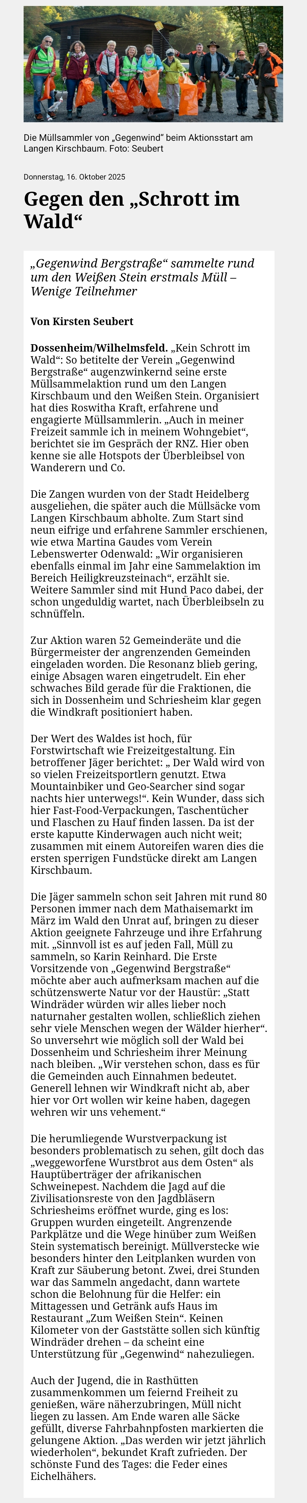 Im letzten Beitrag von „Gegenwind Bergstraße“ im Mitteilungsblatt wird behauptet, dass bereits „Kahlschläge“ und „exzessive Forstwirtschaft“ im Dossenheimer Forst betrieben werde sowie Wege verbreitert werden und es wird angedeutet, dass dies eventuell im Zusammenhang mit dem geplanten Windpark stünde. Wir haben daraufhin bei dem zuständigen Fachbereich der Gemeinde und der Forstverwaltung Dossenheim angefragt und eine ausführliche Antwort erhalten, die wir unten abdrucken und die sich auch mit dem deckt, was bereits in der RNZ zu lesen war: Siehe den von uns gespeicherten Artikel.