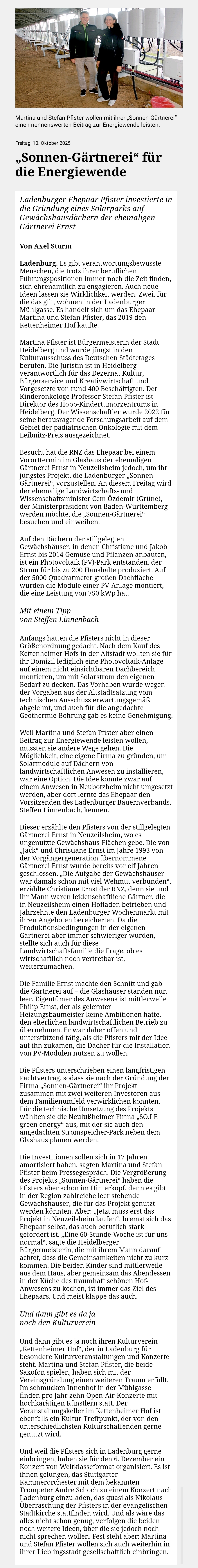 Es wäre schön, wenn der Gemeinderat aus diesen Fehlern lernt und endlich die Energiewende selbst aktiv in Angriff nimmt, anstatt nur jeden Vorstoß zu blockieren, sonst wird es dereinst mit den Windkraftanlagen genauso laufen: Jetzt können Bürger und Gemeinde noch zum Wohle aller gestalten – bei fortgesetzter Komplettblockade wird uns bald die Entscheidung abgenommen: Photovoltaik und Windräder kommen dann dort hin, wo es ein fremder Investor will und ihn reich macht, während Schriesheim weiter in den roten Zahlen steckt und die Bürger den – vielleicht sogar auf ihrem Gemeindegebiet – erzeugten Strom teuer einkaufen müssen, anstatt selbst daran zu verdienen.