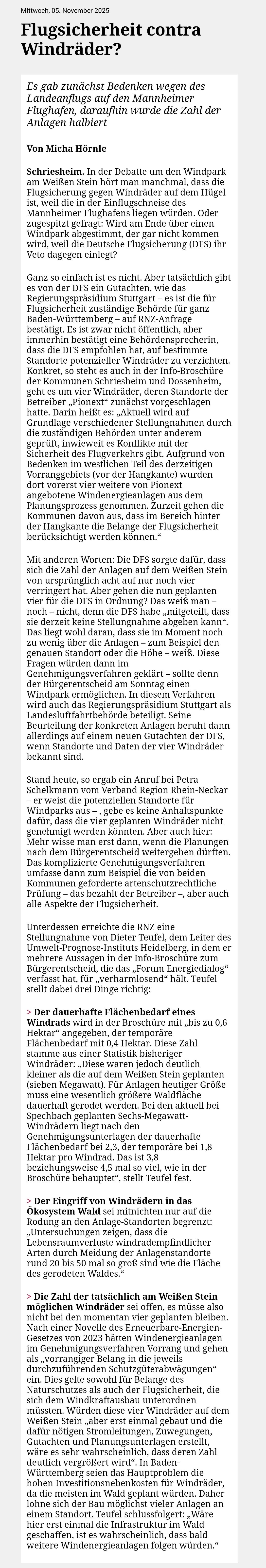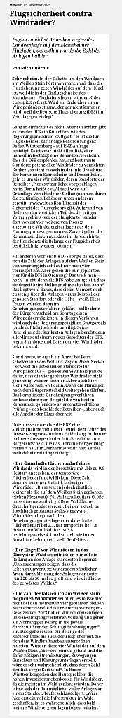 Flugsicherheit contra Windräder? 5. November 2025 / Rhein-Neckar-Zeitung / Keine Kommentare Es gab zunächst Bedenken wegen des Landeanflugs auf den Mannheimer Flughafen, daraufhin wurde die Zahl der Anlagen halbiert Windkraft DossenheimMannheimSchriesheimWindkraft Vorheriger Beitrag Gibt genug Argumente Nächster Beitrag Zur Kernkraft gezwungen? Schreibe einen Kommentar Antworten abbrechenDeine E-Mail-Adresse wird nicht veröffentlicht. Erforderliche Felder sind mit * markiertKommentar * Name * E-Mail * Website Meinen Namen, meine E-Mail-Adresse und meine Website in diesem Browser für die nächste Kommentierung speichern.