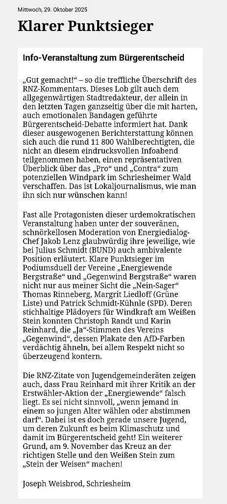 Klarer Punktsieger 29. Oktober 2025 / Rhein-Neckar-Zeitung / Keine Kommentare Leserbrief zur Info-Veranstaltung zum Bürgerentscheid Windkraft DossenheimLeserbriefeSchriesheimWindkraft Vorheriger Beitrag Windkraft macht Simmerath reich Nächster Beitrag “Ich habe das gemacht und ich stehe dazu” Schreibe einen Kommentar Antworten abbrechenDeine E-Mail-Adresse wird nicht veröffentlicht. Erforderliche Felder sind mit * markiertKommentar * Name * E-Mail * Website Meinen Namen, meine E-Mail-Adresse und meine Website in diesem Browser für die nächste Kommentierung speichern.