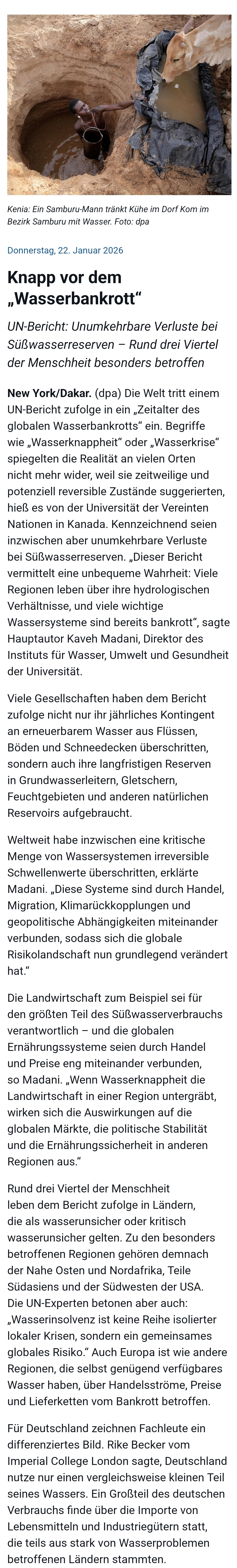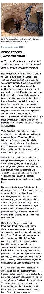 Knapp vor dem “Wasserbankrott” 22. Januar 2026 / Rhein-Neckar-Zeitung / Keine Kommentare UN-Bericht: Unumkehrbare Verluste bei Süßwasserreserven – Rund drei Viertel der Menschheit besonders betroffen Klima KlimaWelt Vorheriger Beitrag Weniger Klagen, mehr Geld Nächster Beitrag Das Bohren des dicken Bretts hat sich gelohnt Schreibe einen Kommentar Antwort abbrechenDeine E-Mail-Adresse wird nicht veröffentlicht. Erforderliche Felder sind mit * markiertKommentar * Name * E-Mail * Website Meinen Namen, meine E-Mail-Adresse und meine Website in diesem Browser für die nächste Kommentierung speichern.