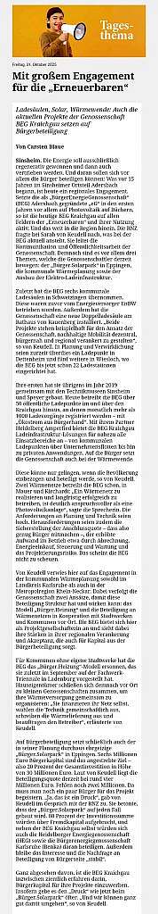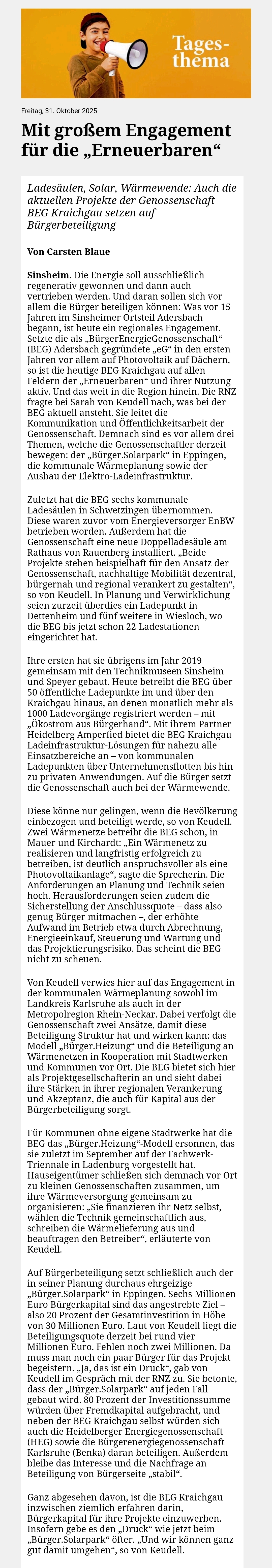 Mit großem Engagement für die “Erneuerbaren” 31. Oktober 2025 / Rhein-Neckar-Zeitung / Keine Kommentare Ladesäulen, Solar, Wärmewende: Auch die aktuellen Projekte der Genossenschaft BEG Kraichgau setzen auf Bürgerbeteiligung Mobilität, Solar, Wärme MobilitätRhein-Neckar-KreisSolarWärme Vorheriger Beitrag Anteil der Erneuerbaren steigt weltweit stärker als erwartet Nächster Beitrag Sie schaffen wertvolle Lebensräume Schreibe einen Kommentar Antworten abbrechenDeine E-Mail-Adresse wird nicht veröffentlicht. Erforderliche Felder sind mit * markiertKommentar * Name * E-Mail * Website Meinen Namen, meine E-Mail-Adresse und meine Website in diesem Browser für die nächste Kommentierung speichern.
