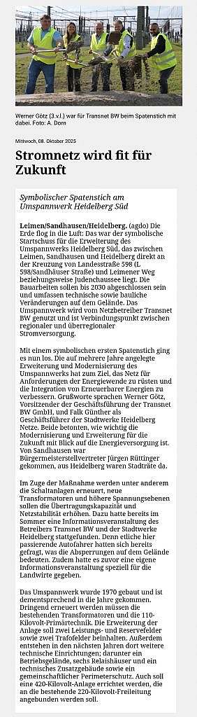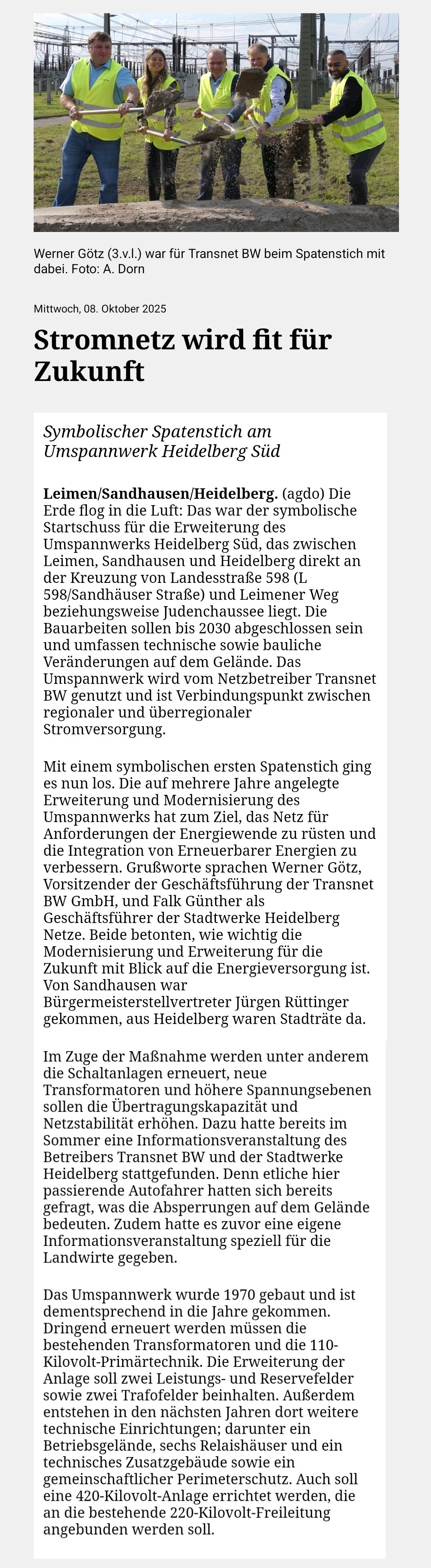 Stromnetz wird fit für die Zukunft 8. Oktober 2025 / Rhein-Neckar-Zeitung / Keine Kommentare Symbolischer Spatenstich am Umspannwerk Heidelberg Süd