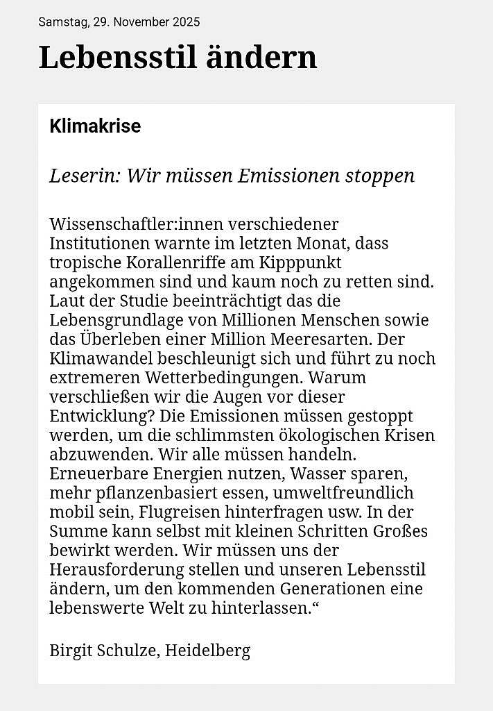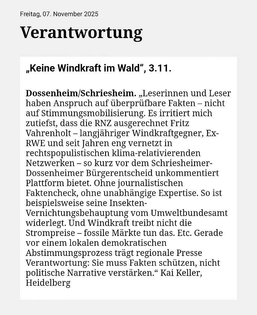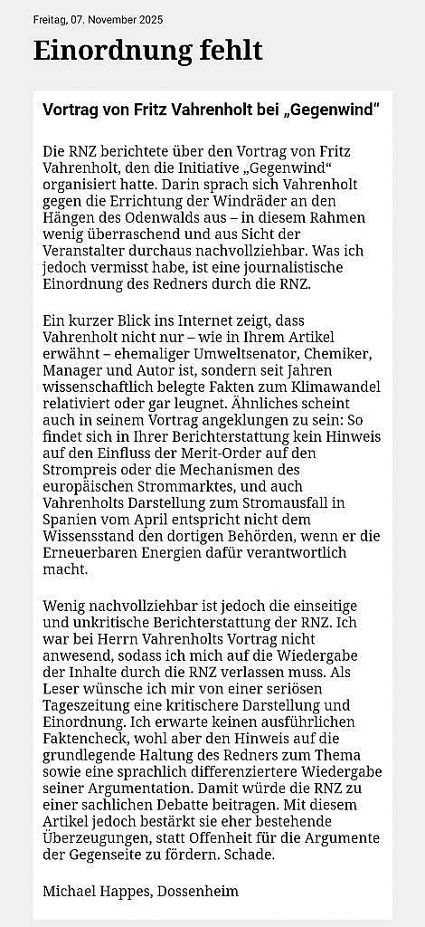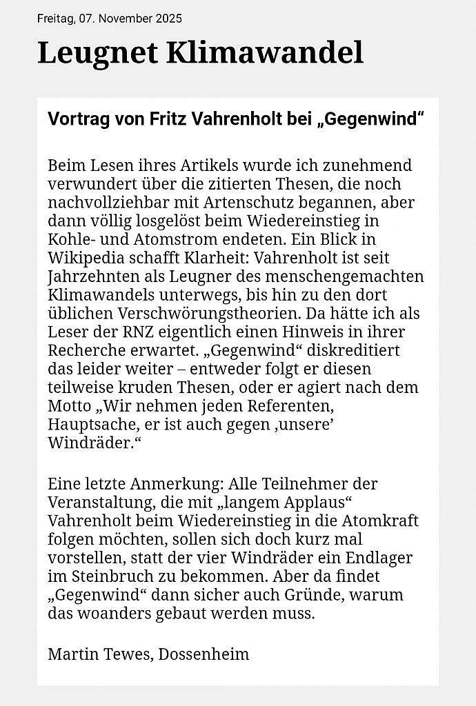 Leserbrief zum Vortrag von Fritz Vahrenholt mit Kritik an der RNZ