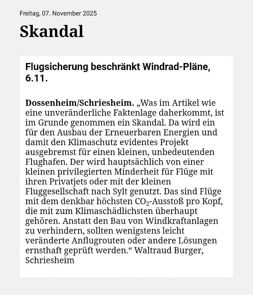 Leserbrief zur Verhinderung von Windkraftanlagen durch die Flugsicherung