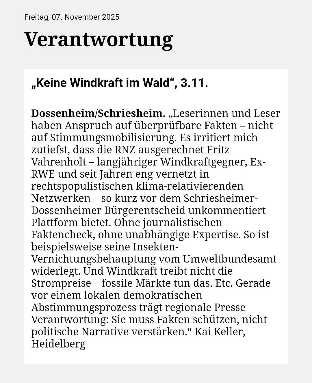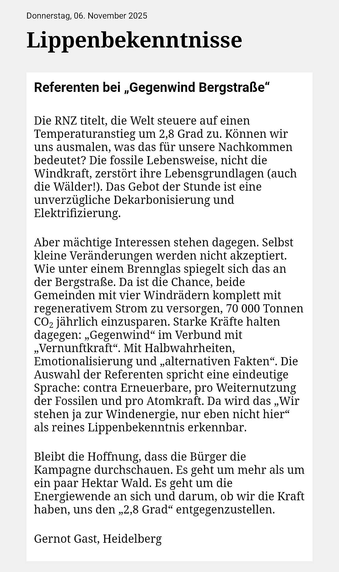 Leserbrief zum Vortrag von Fritz Vahrenholt mit Kritik an der RNZ
