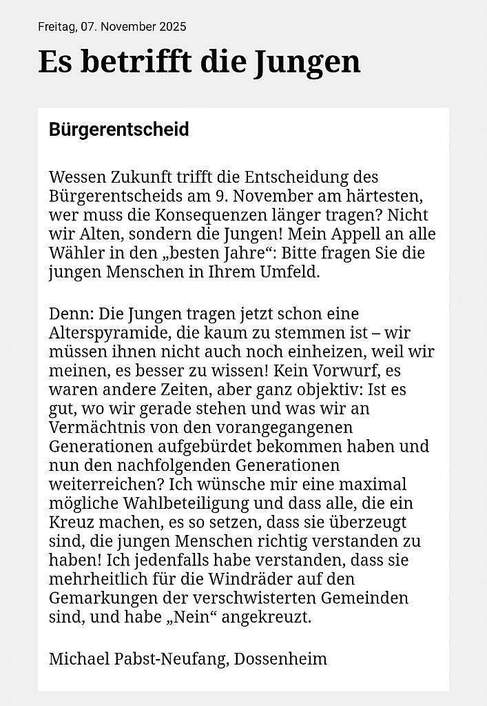 Viele Bürger sind der immer gleichen falschen Behauptungen der Windkraftgegner längst müde. Doch diese wiederholen sie unermüdlich – zuletzt erschienen in der RNZ gleich vier entsprechende Leserbriefe, zwei davon sowohl in der Schriesheimer als auch der Dossenheimer Ausgabe. Daher nun in aller Kürze die entsprechenden Richtigstellungen: