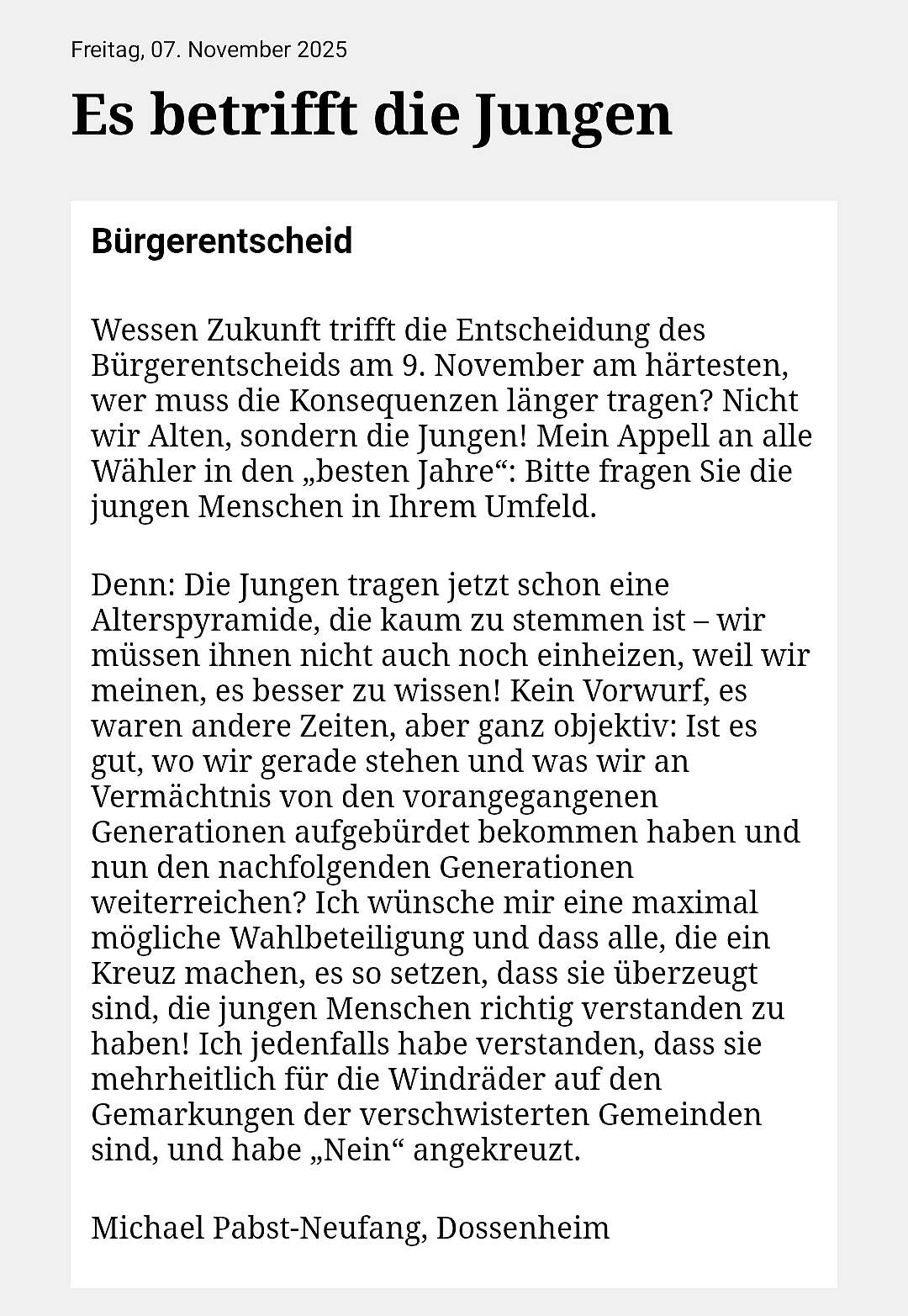 Der Aussage der Herren Kowalinski und Schneider, Windkraft werde mit Millionenbeträgen gefördert, fehlt ebenfalls der Kontext: Zwar fließen jährlich rund 2 Milliarden Euro an Fördermitteln, das sind aber nur etwa 3,3 % der 60 Milliarden Euro an direkten und indirekten Subventionen, die laut Internationalem Währungsfonds in Deutschland für fossile Energien aufgewendet werden – und diese fließen größtenteils ins Ausland, nicht zurück in die Gemeinden oder regionale Betreiber. Volkstwirtschaftlich ist Windkraft daher auf jeden Fall sinnvoll.
