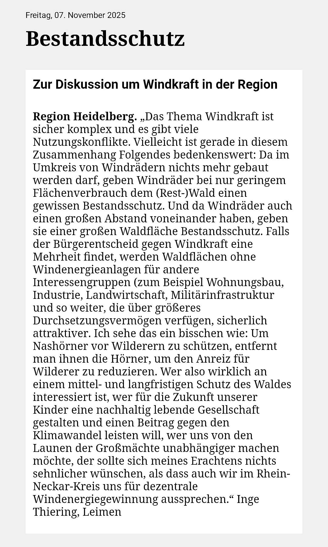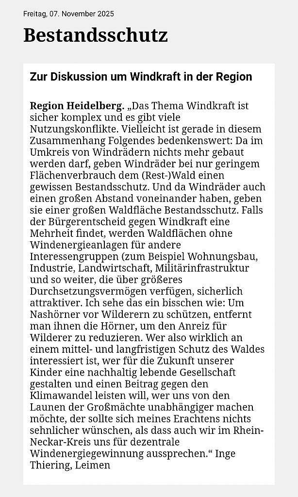 Auch das Argument, der Verband Region Rhein-Neckar (VRRN) habe das Gebiet als „nicht geeignet“ eingestuft, wird erneut falsch dargestellt. Der VRRN hat nämlich erklärt, dass in diesem Fall entweder der Abstand zum Vogelschutzgebiet vergrößert oder eine spezielle Artenschutzprüfung durchgeführt werden muss. Beides wird derzeit von den Gemeinden umgesetzt – der Artenschutz ist also gewährleistet, im Gegenteil: Er wird sogar gestärkt.