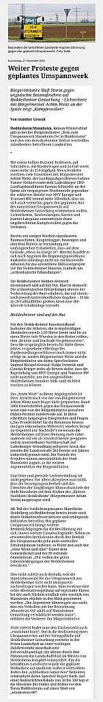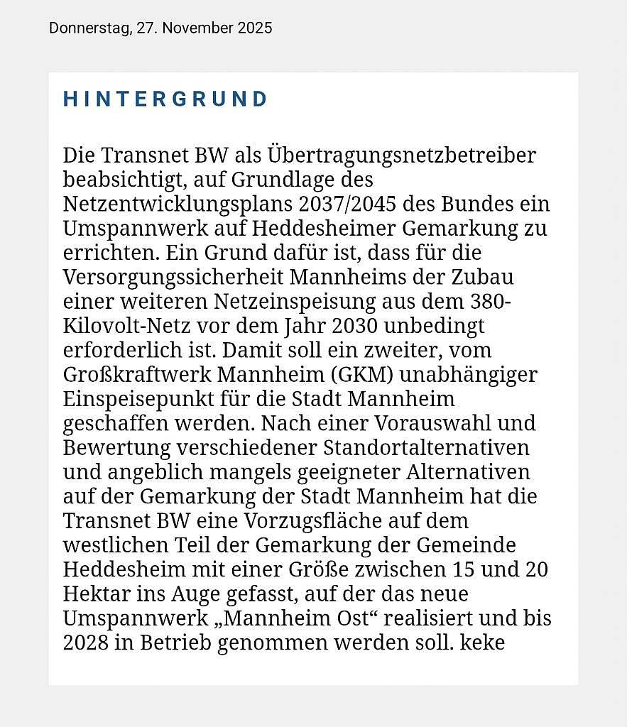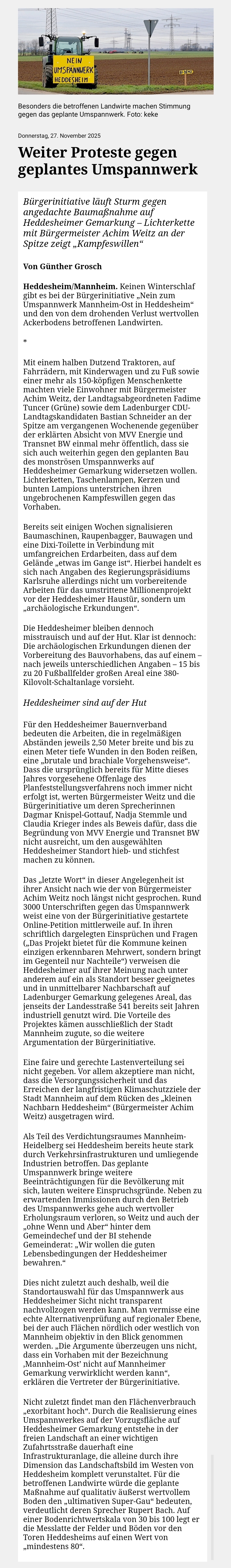 Weiter Proteste gegen geplantes Umspannwerk 27. November 2025 / Rhein-Neckar-Zeitung / Keine Kommentare Bürgerinitiative läuft Sturm gegen angedachte Baumaßnahme auf Heddesheimer Gemarkung – Lichterkette mit Bürgermeister Achim Weitz an der Spitze zeigt “Kampfeswillen” Energiewende EnergiewendeHeddesheimMannheim Vorheriger Beitrag Ein Tunnel unter Schwetzingen Nächster Beitrag Jagd auf Wildtiere eröffnet Schreibe einen Kommentar Antworten abbrechenDeine E-Mail-Adresse wird nicht veröffentlicht. Erforderliche Felder sind mit * markiertKommentar * Name * E-Mail * Website Meinen Namen, meine E-Mail-Adresse und meine Website in diesem Browser für die nächste Kommentierung speichern.